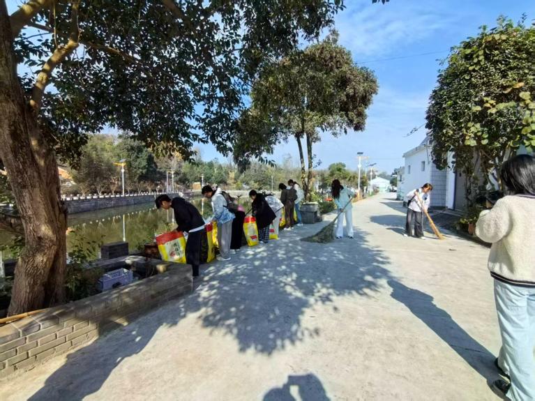 同学们来到帅洼村千鹅冲村民组,手持垃圾袋、夹子等工具,沿着村道、沟渠、房前屋后展开清理,重点捡拾塑料瓶、废旧包装袋等白色垃圾。志愿者们不怕脏、不怕累,弯腰俯身细致清理每一处卫生死角。同学们清理过后,村庄道路变得整洁通畅,沟渠两岸焕然一新。