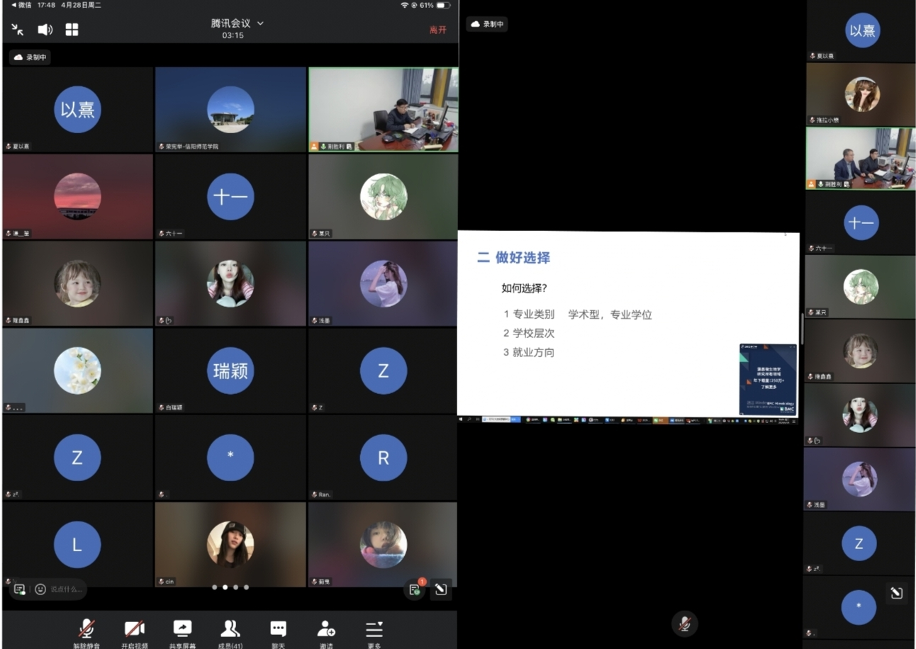 为帮助考研学子明确备考方向、科学制定目标,4月28日,伟德bv1946官网以线上会议形式举办了题为“考研目标定位与选择”学习指导专题讲座,会议由院党委副书记荣宪举主持,副院长荆胜利主讲,围绕考研目标定位与选择展开全面指导,2027届准备考研的学生参加。