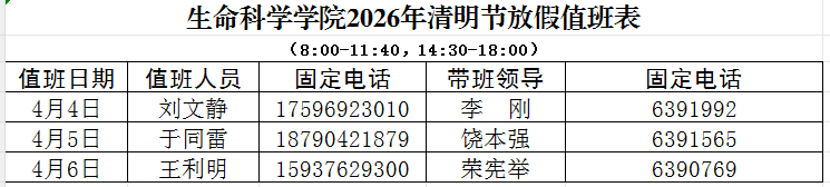 根据《河南省教育厅办公室关于2026年清明节放假安排的通知》和学校《关于2026年清明节放假安排的通知》精神,2026年清明节放假日期安排为4月4日(周六)至6日(周一)放假,共3天。根据学院值班人员安排制度,假期值班安排如下: